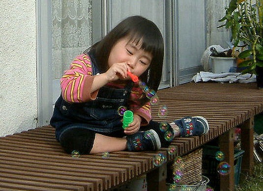 シャボン玉で遊ぶ、こどもの満足そうな表情がいいですね。