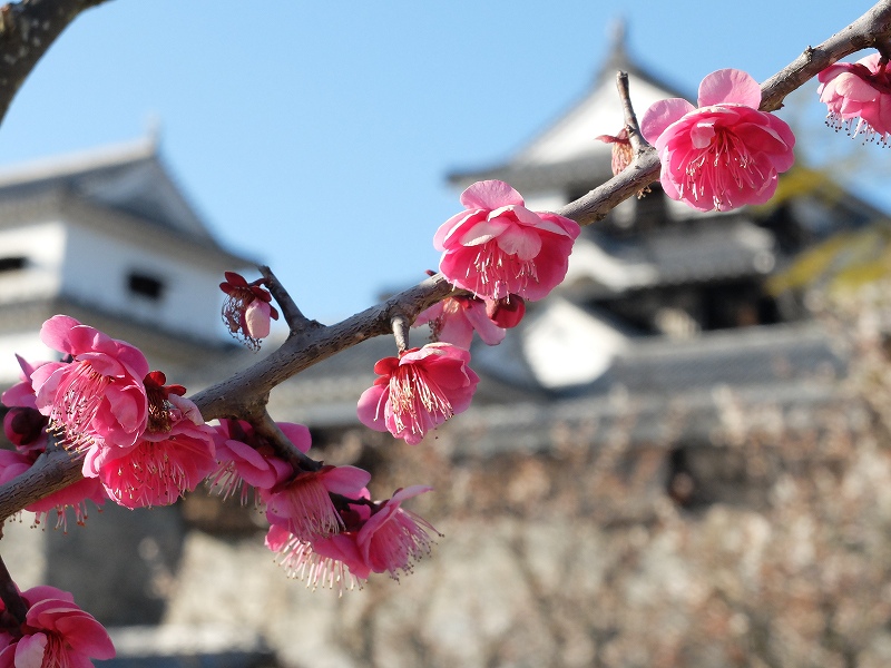 背景のお城をボカシて梅が引き立ちとてもきれいです。