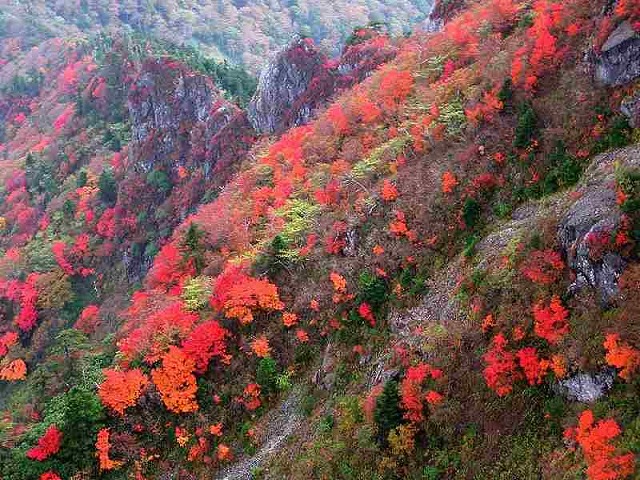 急斜面を彩る紅葉。美しいですね。本物を見てみたいですね!