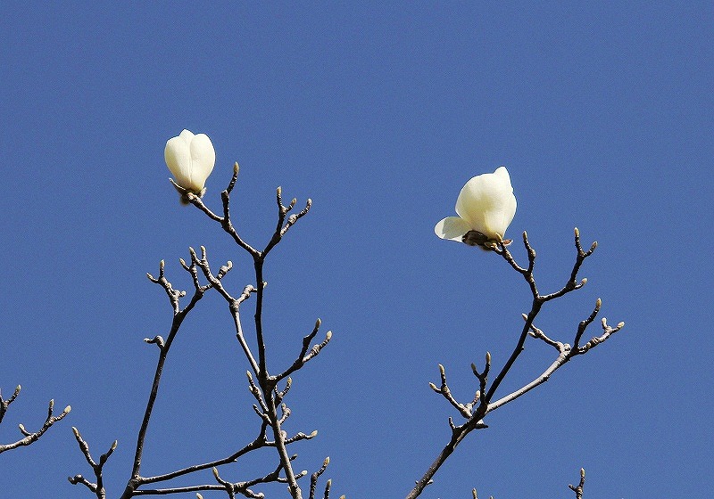 鳩のようにみえますね。 青空に溶け込むように辛夷の花キレイ…。