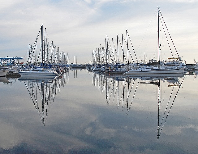 整然と並べたヨット水面に映る雲、素晴らしいですネ