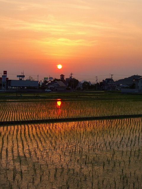 素晴らしい夕日ですネ 美しい雲、水田に映える夕日
