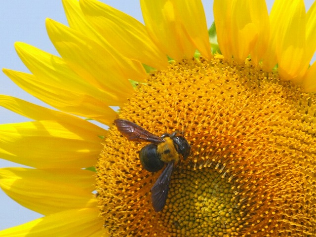 (一 葉) 夏の青い空とひまわりは定番ですが、虫の位置や花の