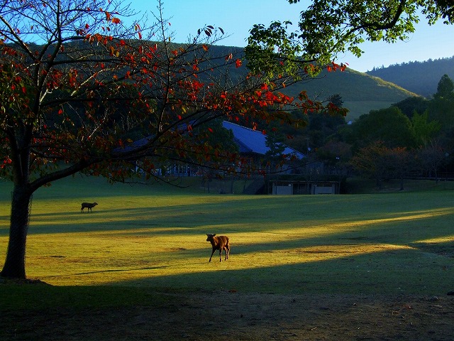 * 朝の奈良公園にて、山影から陽が昇りはじめた瞬間を待ち、