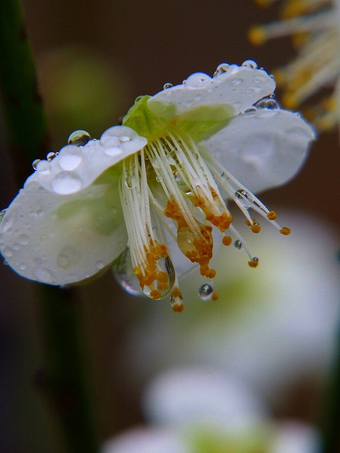 * 早朝、雨上がりの白梅を見つけました。