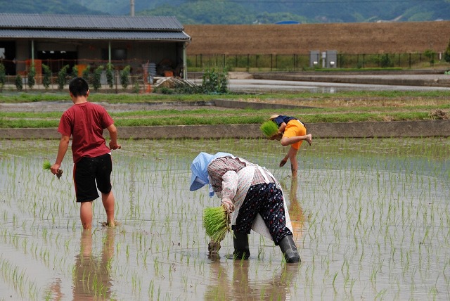 * 入梅を前にいっせいに田植えが始まり、現代ではめずらしいほほえましい光景でした。
