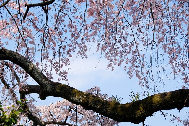 しだれ桜と横向きの枝、いい構図だと思います。