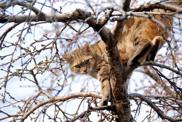 ☆ 桜の蕾の枝にこっちをにらんでいる猫の姿がおもしろかった。