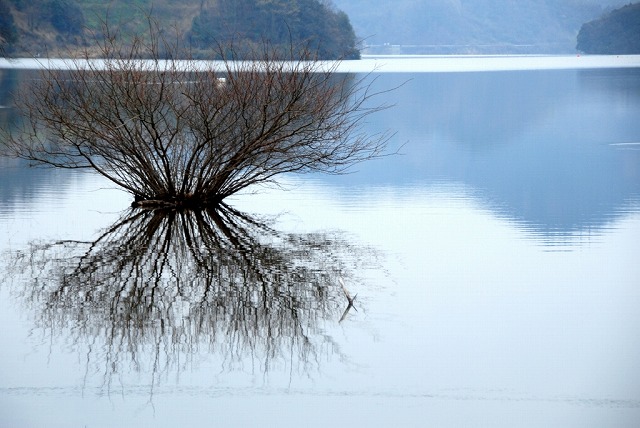 湖面の枯れ木の上部が、明るく光った湖面の線に切られているのが残念ですね。