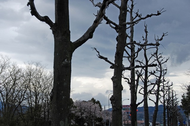 どんよりとした雲、木立の向こうの桜、静かな光景ですネ