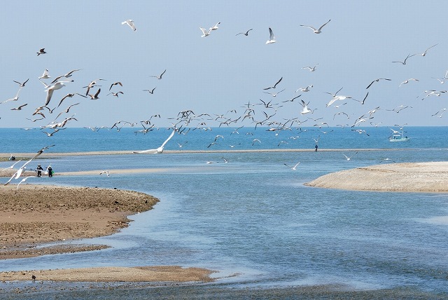 ☆ 人も、かもめも干潮の時刻には獲物を狙っています。(重信川河口)