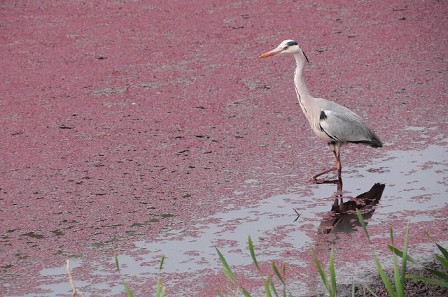 ピンク色した水面に凛として立つ鷺、なんとも良い光景ですネ