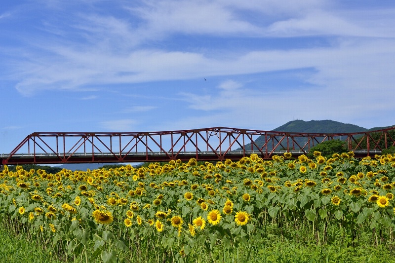 向日葵がきれい…鉄橋が空にくっきりと溶け込んで。
