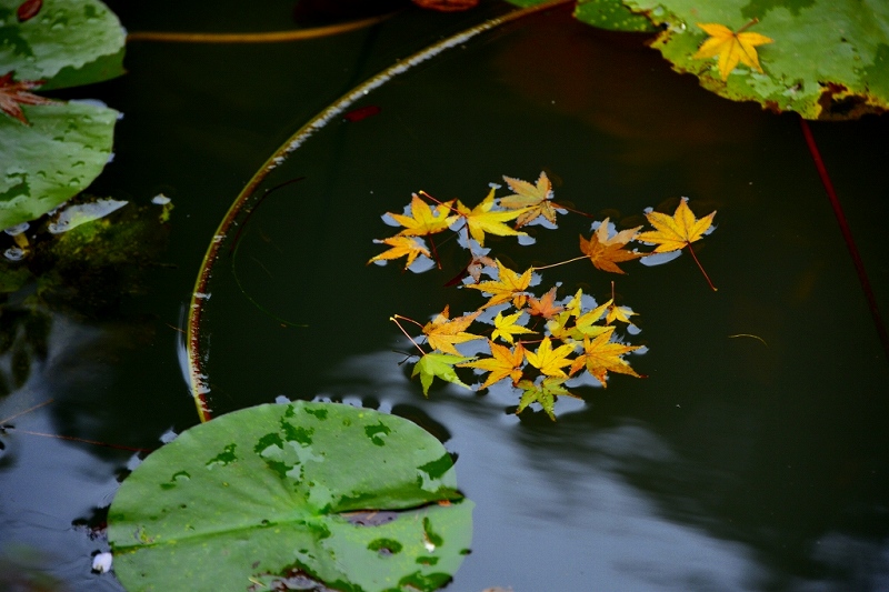 散り紅葉が水面の黒に映えて綺麗ですネ。