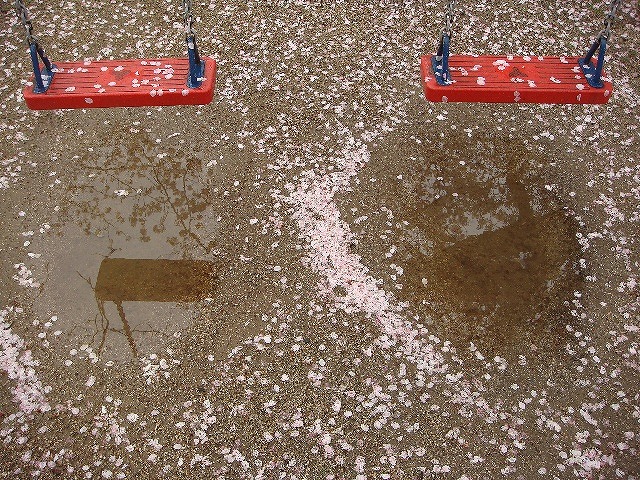 花びらを散りばめた地面とブランコの赤、水溜りの影絵も
