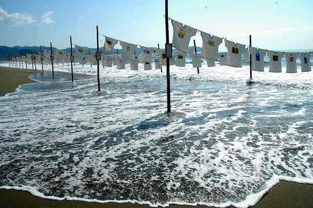引潮の時に干したティシャツ?ティシャツの枚数に驚きました。お見事です。美しい!!。