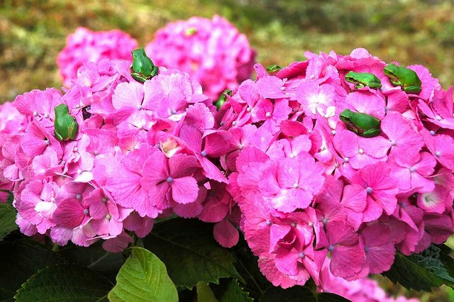 (夢一夜) 紫陽花のピンク色に蛙のグリンが綺麗〜それにカエルが七匹もいて