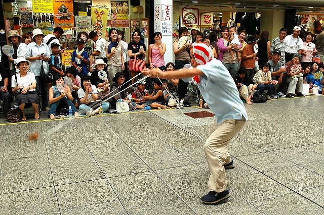 珍しい見せ物ですね。コマを回しているおじさんの顔が見たいです。