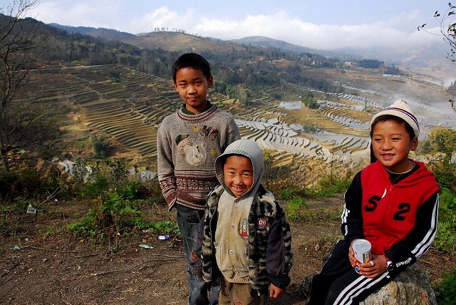 ☆ 広大な棚田をバックに明るい地元の子供たちのスナップです。