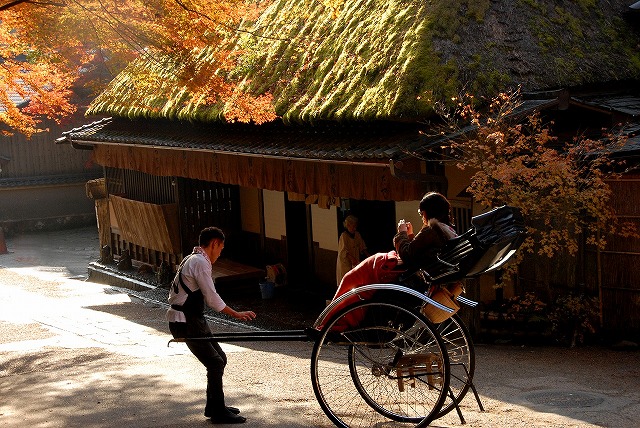紅葉、かやぶき屋根をポイントの人物と構成がいいので絵葉書のようです。