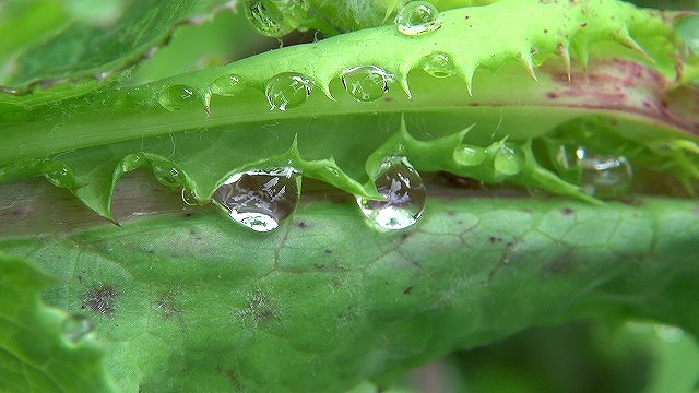 色鮮やかなグリーンに露の連なり、幻想的ですね