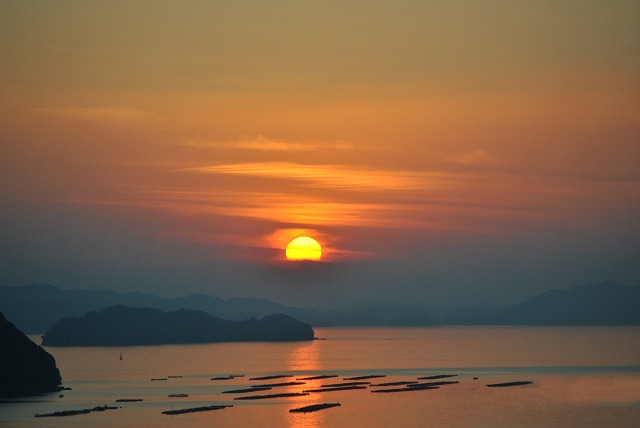 筏と灯台が入ってとてもきれいな夕景ですね。
