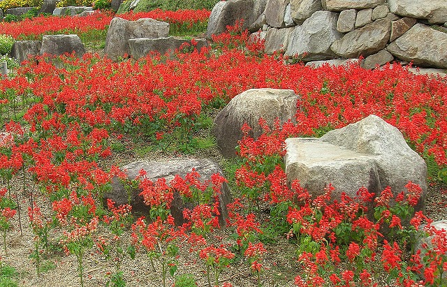 サルビアの群生って珍しいですね。彼岸花のように見えます。