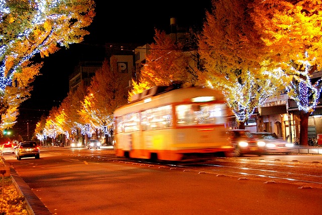 (一 葉) 黄葉とイルミネーションの中を走り抜けて行く電車、見慣れているようでも