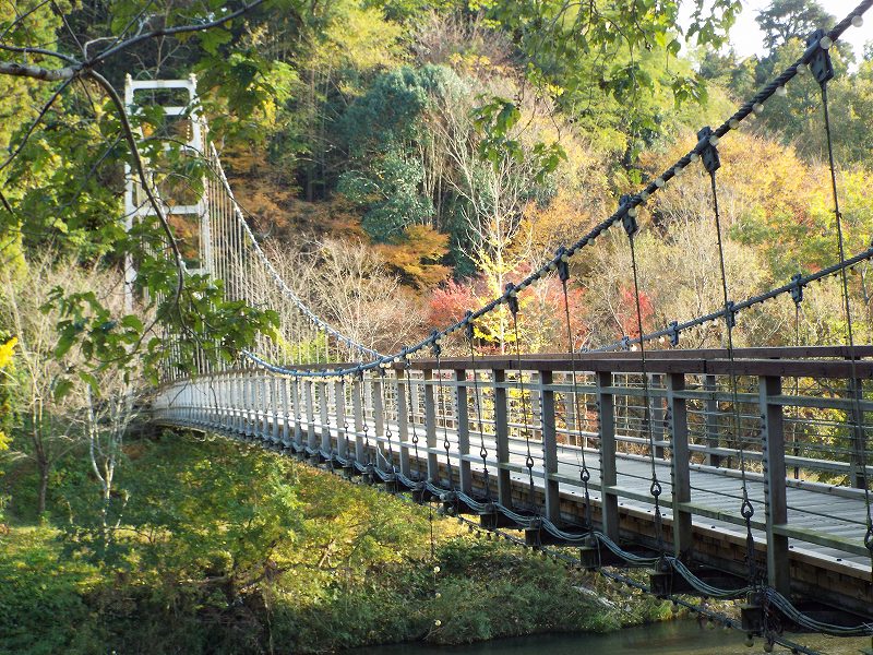 秋の風景の中に吊り橋が、何処でしょうか。行ってみたいです。