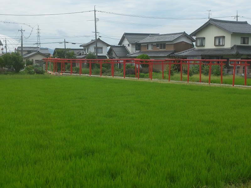 赤い鳥居が緑の稲?とマッチしてきれいですね。