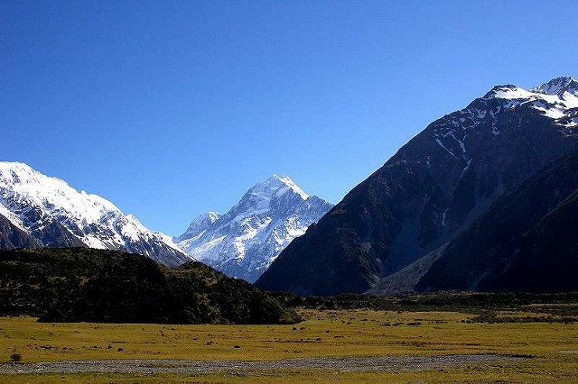 * 南半球の初夏 NZ最高峰マウント、クック(3754m)の万年雪を望む。